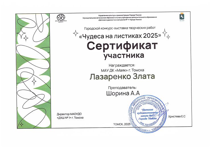 - 2 сертификата за участие-Шаяхметова Анастасия и Лазаренко Злата.