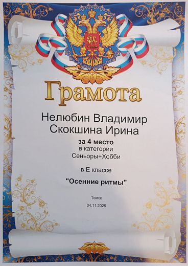 Пара Нелюбин Владимир и Скокшина Ирина показали хороший результат, завоевав 4 место в категории "Сеньоры+Хобби" в Е классе. Это достижение, которое подтверждает высокий уровень подготовки и талант танцоров!