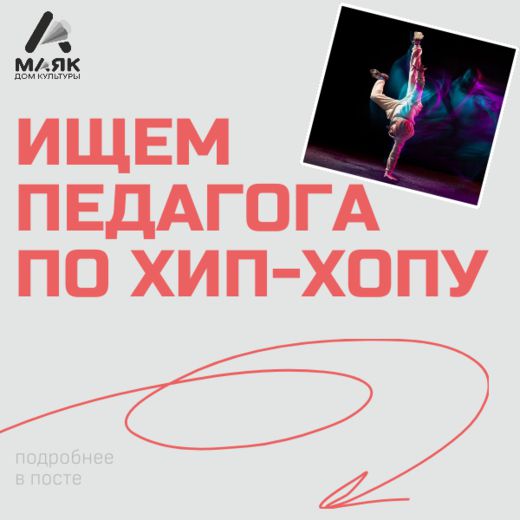 В наш дружный коллектив требуется педагог по хип-хопу! Ищем талантливого и креативного специалиста, который готов делиться своим опытом и вдохновлять ребят на творческие достижения. Если ты обладаешь страстью к танцам и умением находить общий язык с детьми и подростками, мы ждем именно тебя!
