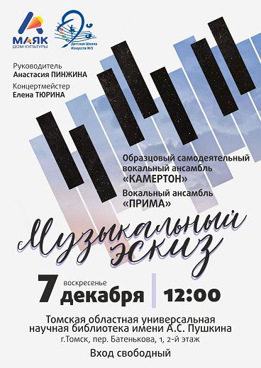7 декабря в Томской областной универсальной научной библиотеке имени А.С. Пушкина прошёл концерт "Музыкальный эскиз" с участием вокального ансамбля "Прима" (ДК "Маяк") и образцового самодеятельного вокального ансамбля "Камертон" (Детская школы искусств №3).
