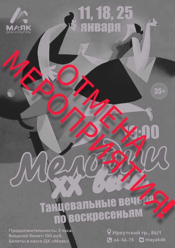 Танцевальный вечер "Мелодии ХХ века" отменяются в связи с неблагоприятными погодными условиями.