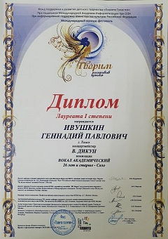 Участник вокального ансамбля "Лидия" продемонстрировал высокий уровень таланта. Солист Ивушкин Геннадий стал Лауреатом 1 степени в номинации "Вокал академический". Его уникальный голос и артистизм покорили жюри!