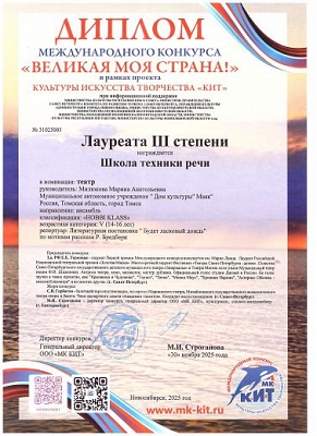 Диплом Лауреата 3 степени — литературная постановка "Будет ласковый дождь" по мотивам рассказа Р. Бредбери.