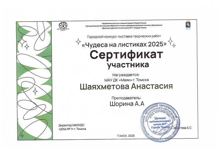 - 2 сертификата за участие-Шаяхметова Анастасия и Лазаренко Злата.