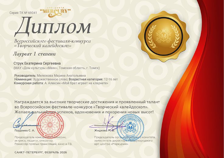 - Струк Екатерина с работой А. Алексин "Мой брат играет на кларнете" (возрастная категория 12-16 лет).